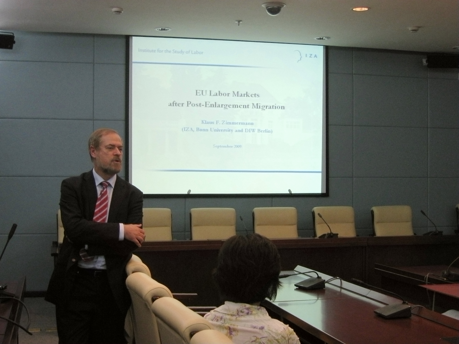 On September 21, 2009, Prof. Klaus F. Zimmermann, a world-renowned labor economist from the University of Bonn visited SUFE and met SUFE Vice President Zhongfei Zhou. He delivered a lecture titled "EU Labor Markets after Post-Enlargement Migration" at the seminar room of SOE building and communicated with SOE faculty members and students.