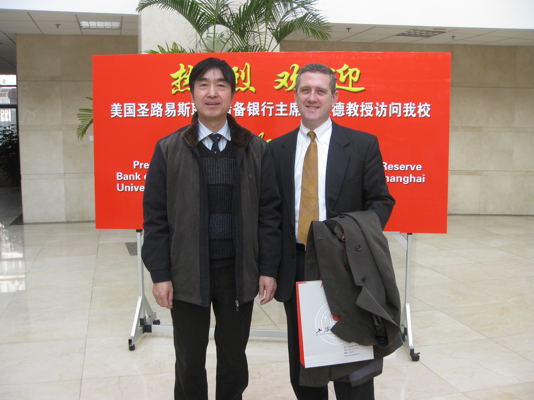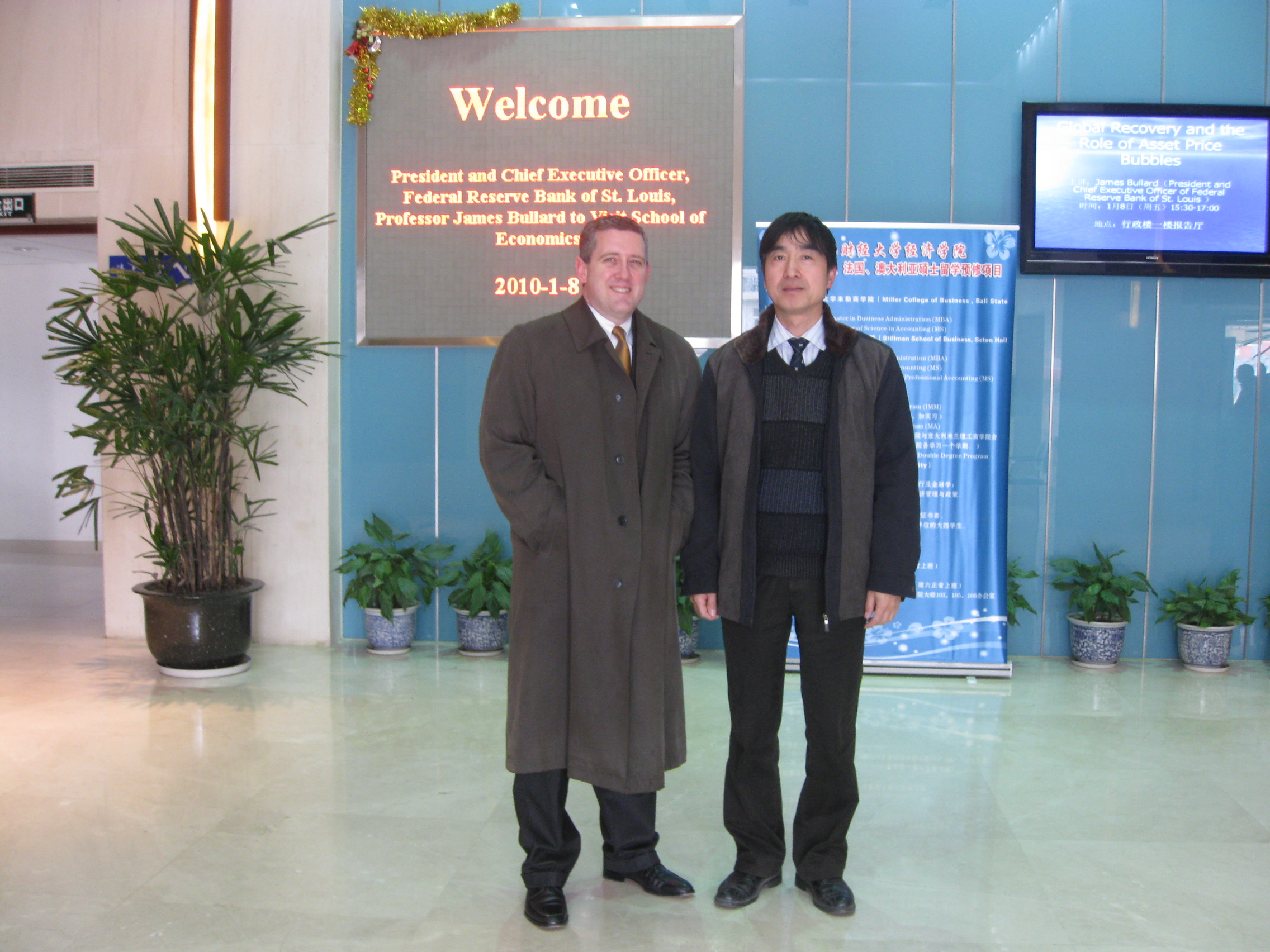 On January 8, 2010, Dr. James Bullard, President and Chief Executive Officer of Federal Reserve Bank of St. Louis visited SUFE and met with SUFE CPC Committee Secretary Qingrong Ma, SUFE International Exchange Office Director Yamin Jin and SOE Senior Associate Dean Yonggang Hu. Chairman Ma extended his cordial welcome to Pres. Bullard and expressed his sincere hope for further academic communication in the future.