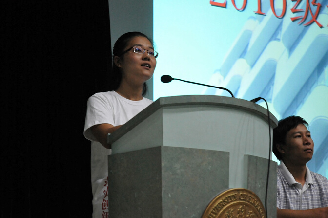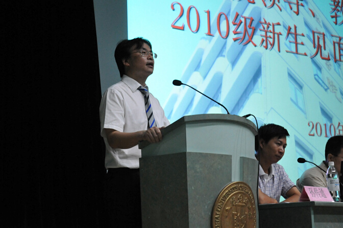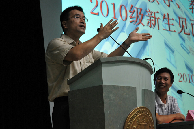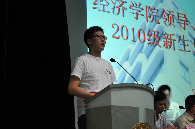 Prof. Cheng first gave a brief introduction to the history and rapid development of SOE, and extended his sincere hope for the students to be honest, creative and capable. Following his address, Prof. Xia introduced the regulations of SOE and echoed with Prof. Cheng by emphasizing honesty and integrity of the students. Welcome speeches were then given by Heads of the four Departments of Economics, Economic History, Political Economy and Quantitative Economics. The ceremony ended with the passionate speech made by the representative of fresh students Yapeng Liu, who promised that they will "try their best to live up to the expectations of the professors".